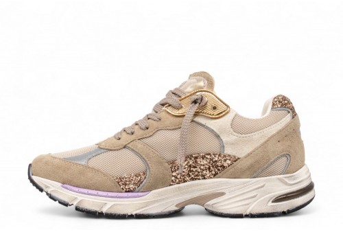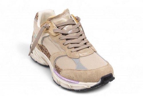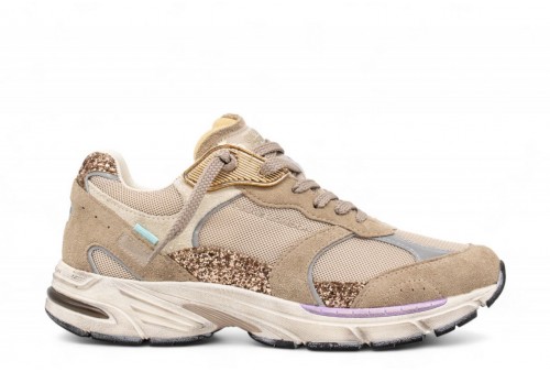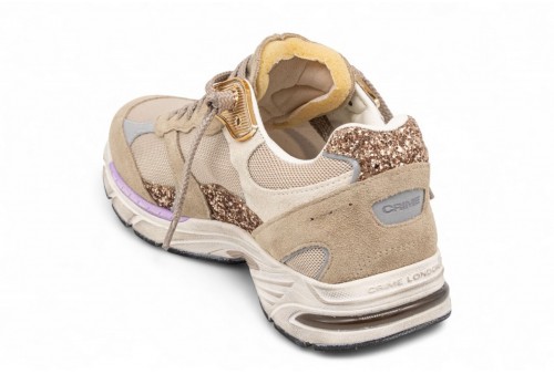 CRIME FUGITIVE 9094 COPPER FLARE. Sneaker Chunky Crime London realizzata con un mix di materiali in tonalità neutre, arricchita da inserti in glitter color rame, un elemento metallico dorato sui lacci e dettagli a contrasto. La tomaia è costruita con un sofisticato layering di camoscio, pelle e mesh traspirante in sfumature che vanno dal beige al tortora. Il focus del design è l'inserto laterale in glitter color rame/bronzo (Copper Flare) e il passante dorato dei lacci che ne enfatizzano il nome. La suola chunky ammortizzata,è massiccia e offre un notevole rialzo e un'ottima stabilità.