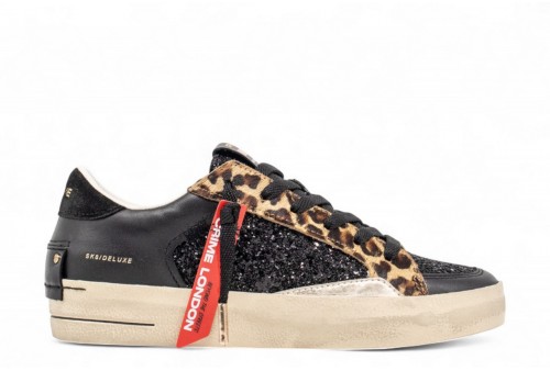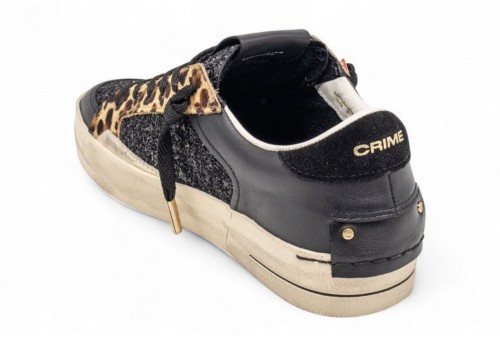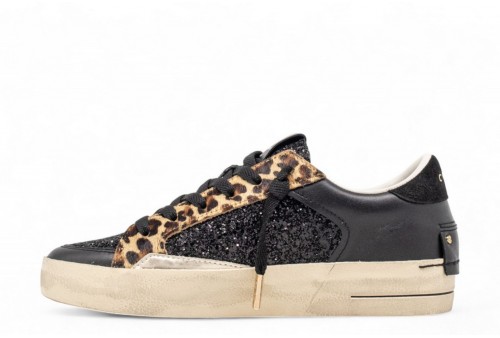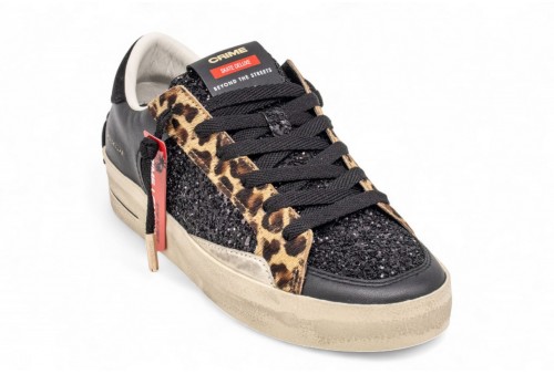 CRIME SK8 DELUXE BLACK CHEETAH. Sneaker realizzata con materiali di alta qualità Made in Italy. Effetto vintage. Tomaia in glitter e pelle neri, dettagli in lamina platino. Talloncino in suede nero. Linguetta in glitter neri con label logata in pelle. Patch in pelle nera sul retro. Laccio nero in poliestere. Unico tag lucido rosso.  Vestibilità regular.