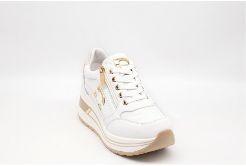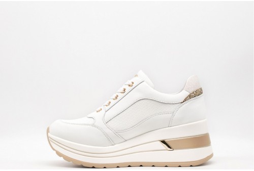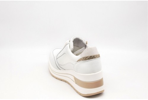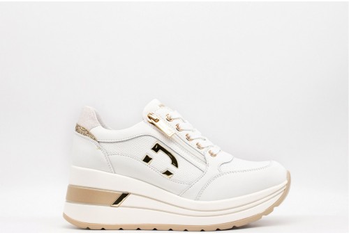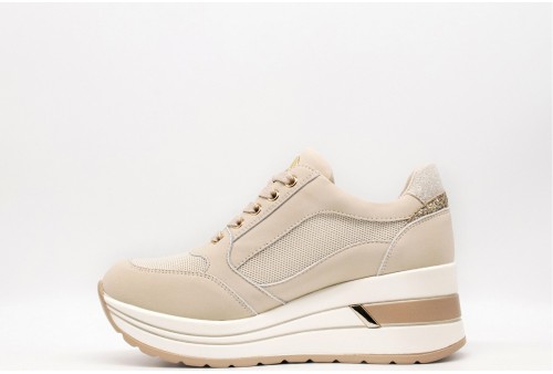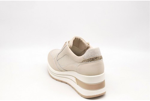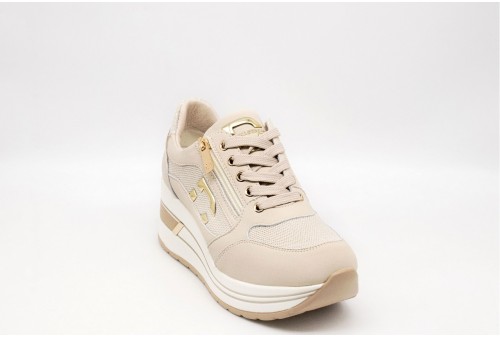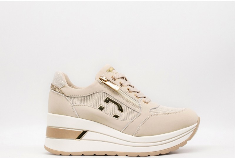 DONNA SERENA SNEAKER con zeppa. Sneakers in pelle scamosciata. Dettagli in pelle laminata platino. Logo laterale e sulla linguetta. Chiusura con stringhe e zip. COLORE: beige