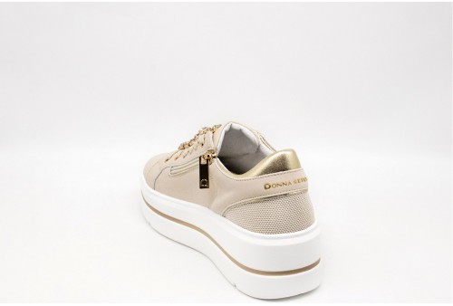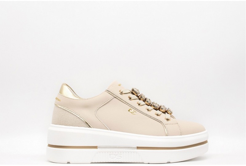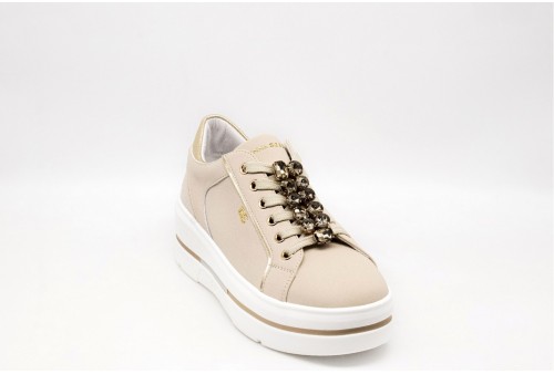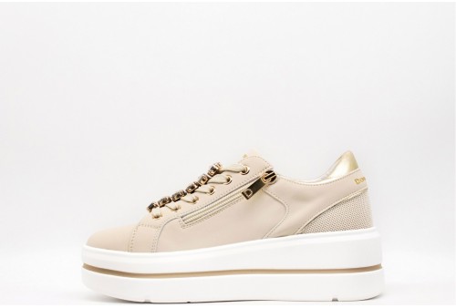 DONNA SERENA SNEAKER PLAFORM. Sneakers in pelle con accessorio gioiello sui lacci. Dettagli in pelle laminata platino. Logo laterale e sulla linguetta. Chiusura con stringhe e zip. COLORE: beige