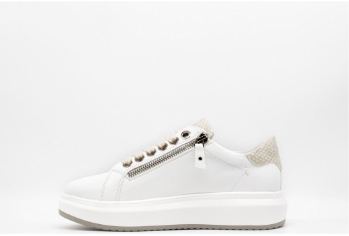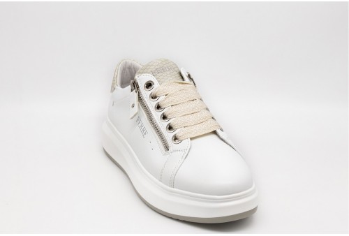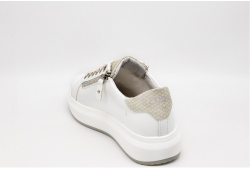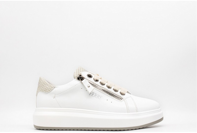 FERRE' SNEAKER CON ZIP. Sneakers donna realizzata in ecopelle. Presenta chiusura con lacci in cotone sul davanti e doppia cerniera laterale, plantare estraibile. Fondo gomma di cm 4. Logo laterale. Colore: bianco/argento