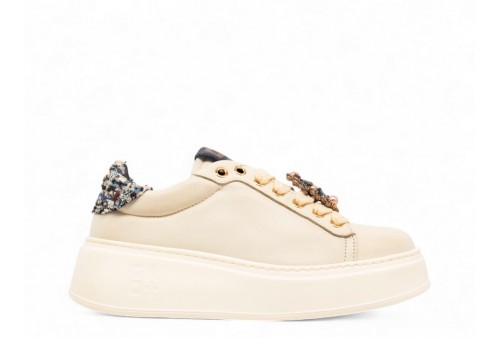 GIO + SNEAKERS ACCESSORIO GIOIELLO . Sneakers in pelle di vitello caratterizzata da passalacci gioiello e a forma di orsetto al piede sx e un solo gioiello più grande sul piede dx. Label sulla linguetta con il logo. Il fondo platform è in leggerissima gomma tono su tono e rialza il tallone dal suolo di 4 cm. Internamente è foderata in pelle. Soletta interna estraibile. COLORE: PANNA