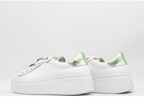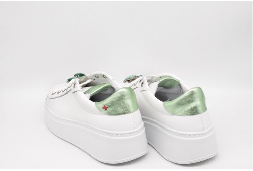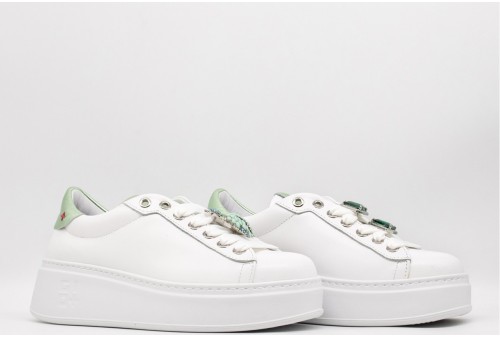 GIO + SNEAKERS GIOIELLO INSETTO. Sneakers in pelle di vitello di colore bianco. Caratterizzata da passalacci gioiello al piede sx e insetto al dx di colore verde. Label sulla linguetta con il logo. Il fondo platform è in leggerissima gomma di colore bianco e rialza il tallone dal suolo di 4 cm. Internamente è foderata in pelle. Soletta interna estraibile. COLORE: BIANCO/verde Tomaia: Pelle Fodera: Pelle Sottopiede: Pelle Fondo: Gomma Altezza: 4 cm Chiusura: con Stringhe Collezione: Primavera/Estate Codice:PIA302A-wv