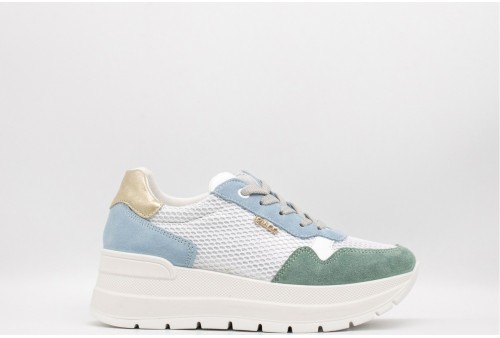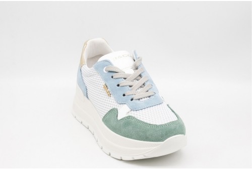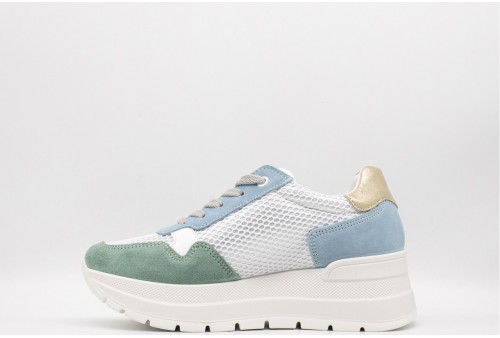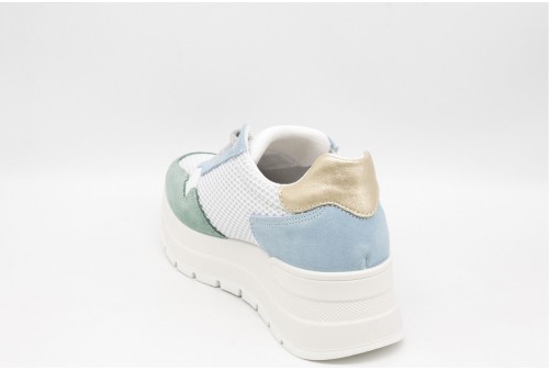 IGI & CO Sneakers con zeppa da donna menta-celeste. Sneakers donna in pelle traforata con inserti in pelle scamosciata color menta-celeste, il retro è laminato.