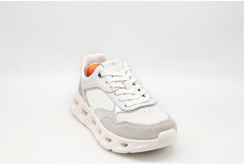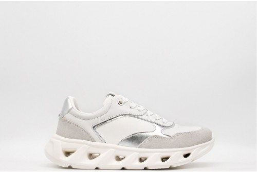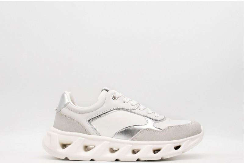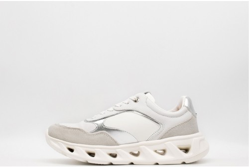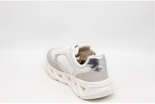 IMPRONTE SNEAKER SAN MARCO. Sneakers realizzata in pelle con dettagli in pelle laminata e inserti in pelle scamosciata. Suola flessibile e leggera con zeppa. Plantare memory. COLORE: white/silver