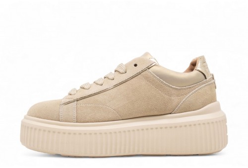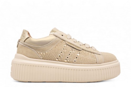 JANET E JANET Sneaker in camoscio. Sneaker realizzata in suede con dettaglio strass. Talloncino e linguetta in pelle laminata. Logo laterale. Suola in gomma. COLORE: beige