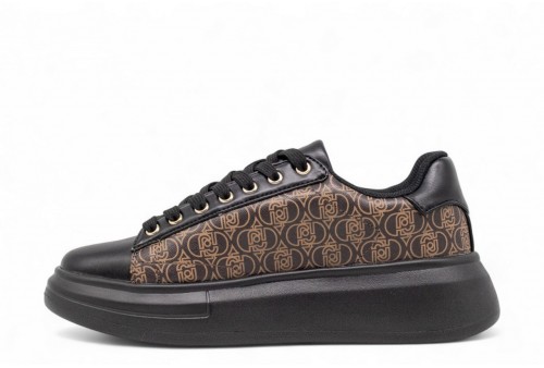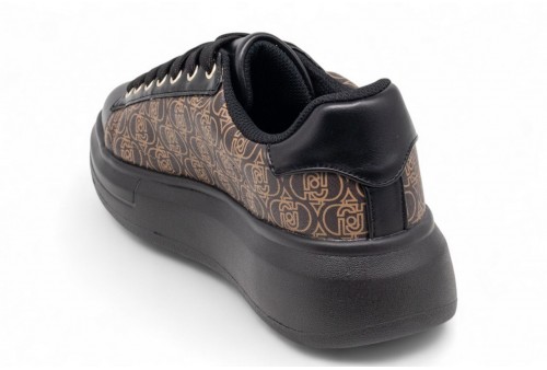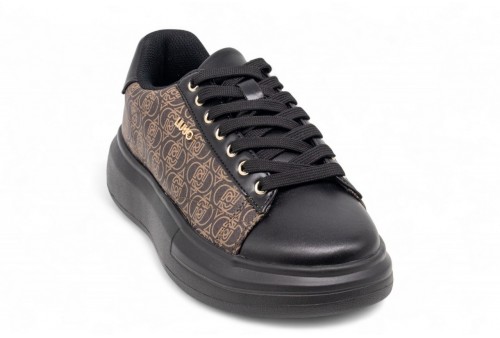 LIU JO SNEAKER BABOL 01 . Sneaker realizzata in pelle nera con logo all over sulla tomaia. Logo in metallo. COLORE: NERO/marrone