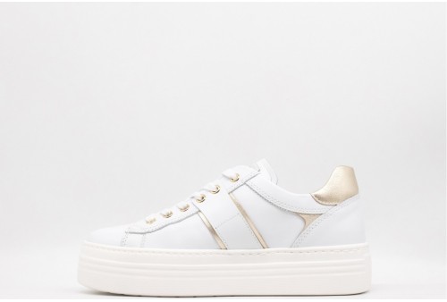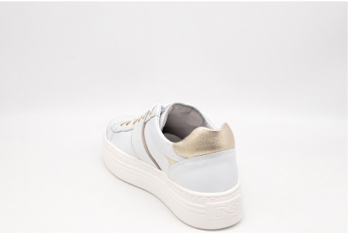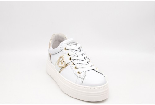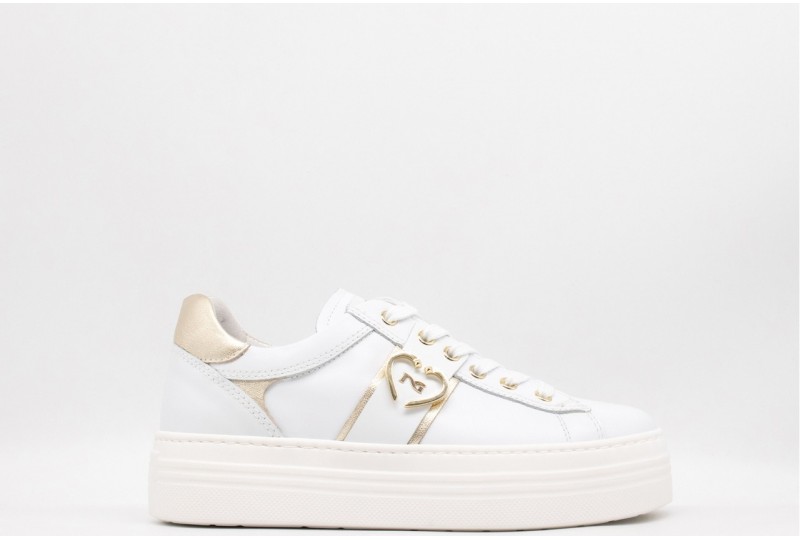 NERO GIARDINI Sneaker DONNA. Sneaker platform con cuore in metallo platino. Realizzata in pelle con inserti in pelle laminata . Logo in metallo dorato laterale. Logo sulla linguetta. Colore: SKIPPER BIANCO Tomaia: Pelle . Fodera: pelle Sottopiede: pelle Fondo: Gomma Altezza: 4cm Chiusura: con Stringhe Collezione: primavera/estate Codice: E513022D