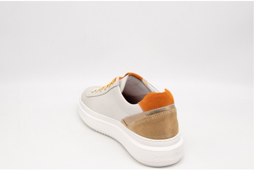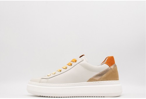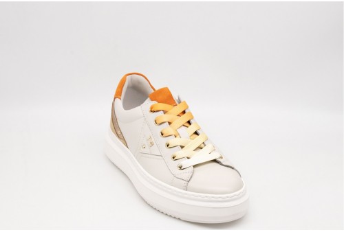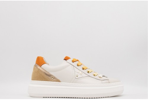 NERO GIARDINI Sneaker DONNA. Sneaker realizzata in pelle con inserti in pelle laminata e suede . Logo sulla linguetta. Lacci sfumati sui toni dell'arancio. Colore: VELVET OSSO Tomaia: Pelle e suede . Fodera: pelle. Sottopiede: pelle. Fondo: Gomma. Altezza: 4 Cm Chiusura: con Stringhe Collezione: primavera/estate Codice: E513041D