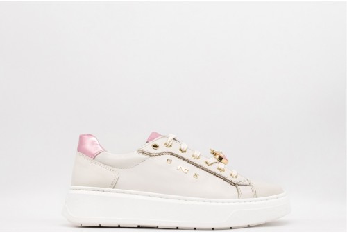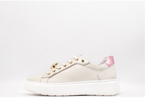 NERO GIARDINI Sneaker DONNA. Sneaker bassa con gioiello. Realizzata in pelle con inserti in pelle laminata impreziosita da accessorio gioiello sui lacci. Logo in metallo dorato laterale. Stampa logo sulla linguetta. Colore: Velvet osso Tomaia: Pelle , tessuto. Fodera: pelle Sottopiede: pelle Fondo: Gomma Altezza: 4cm Chiusura: con Stringhe Collezione: primavera/estate Codice: E513060D