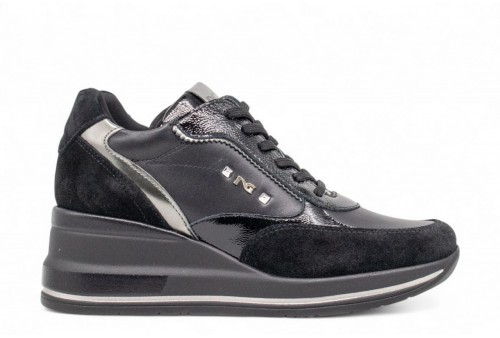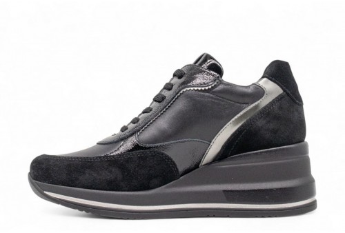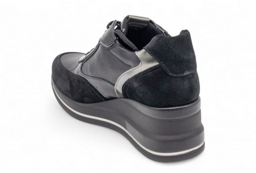 NERO GIARDINI SNEAKER IN CAMOSCIO. Sneaker donna con zeppa, realizzata in pelle nera e inserti in pelle scamosciata. Logo in galvanica oro. Chiusura con lacci . Fondo in gomma. COLORE: nero