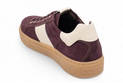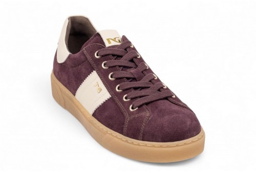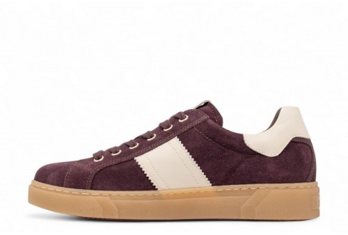 NERO GIARDINI SNEAKER IN CAMOSCIO. Sneaker donna realizzata in pelle scamosciata con banda laterale in pelle a contrasto. Talloncino in pelle . Logo in galvanica oro. Fondo in gomma. COLORE: bordeaux