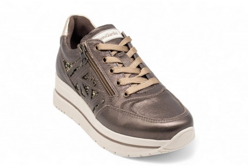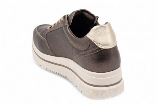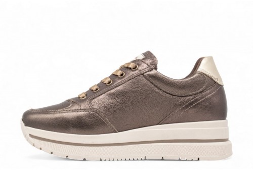 NERO GIARDINI SNEAKER IN PELLE. Sneake donna realizzata in pelle. Talloncino in pelle laminata a contrasto. Logo in galvanica oro. Chiusura con lacci e zip laterale per facilitarne la calzata. Fondo platform in gomma. COLORE: T.MORO