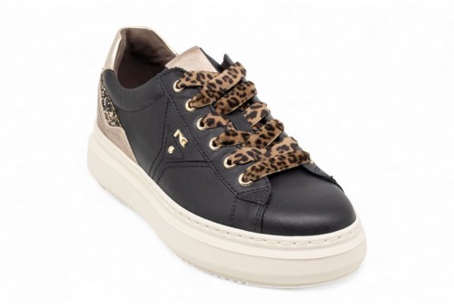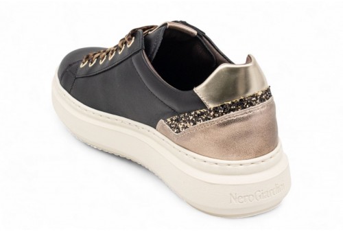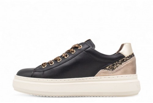 NERO GIARDINI SNEAKER IN PELLE. Sneaker donna realizzata in pelle con inserto in pelle laminata al tallone. Talloncino in pelle . Logo in galvanica oro. Fondo in gomma. COLORE: nero