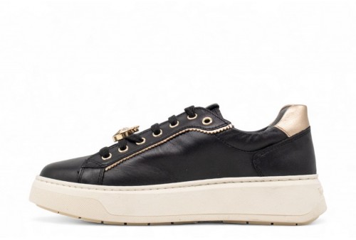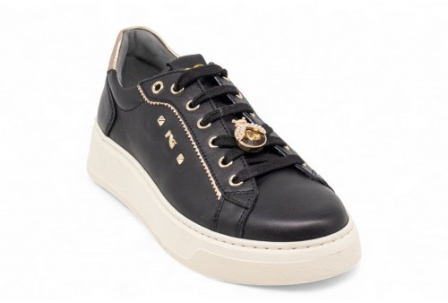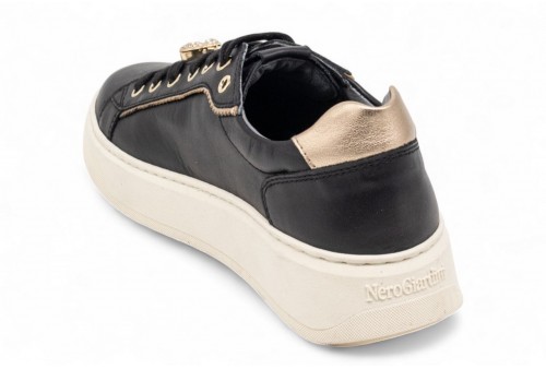NERO GIARDINI SNEAKER IN PELLE. Sneaker donna realizzata in pelle e impreziosita da passalaccio gioiello. Talloncino in pelle laminata . Logo in galvanica oro. Fondo in gomma. COLORE: nero