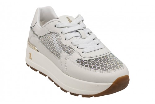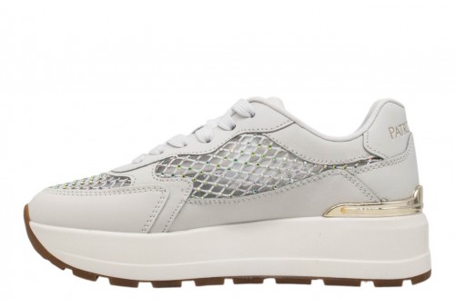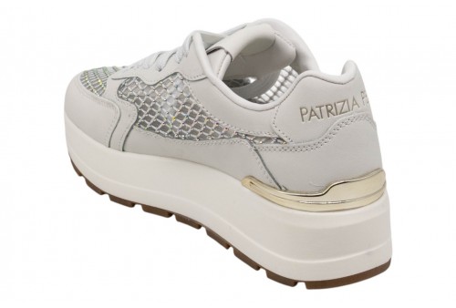 PATRIZIA PEPE DONNA SNEAKER PPJ368.27 BIANCO VITELLO. Sneaker con platform realizzata in pelle con inserti in tessuto traforato. Applicazione logo in metallo platino. Spoiler in pelle con logo impresso. Chiusura con lacci.