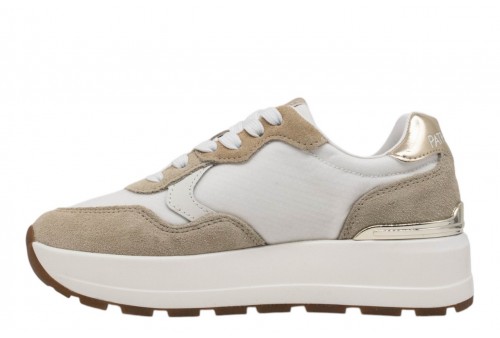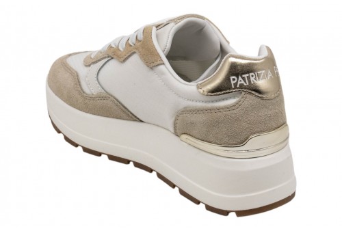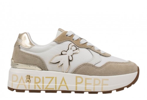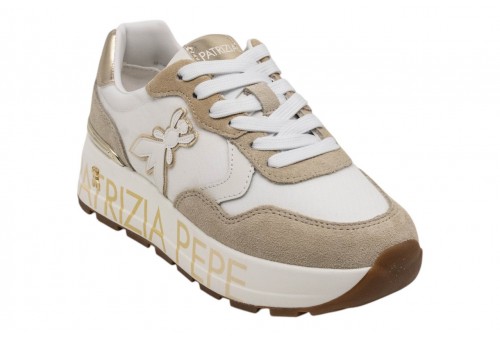 PATRIZIA PEPE donna sneaker PPJ369.02 CROSTA BEIGE. Sneaker con platform realizzata in pelle con inserti in suede. Applicazione logo in metallo platino. Spoiler in pelle laminata platino con logo impresso. Maxi logo sulla suola. Chiusura con lacci.