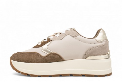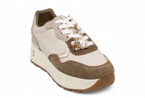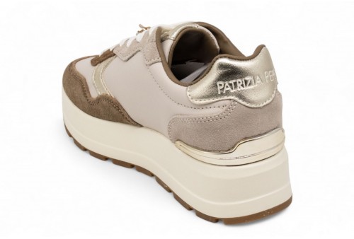 PATRIZIA PEPE SNEAKERS IN PELLE. Sneaker modello running con zeppa realizzata in pelle con inserti in pelle laminata e in camoscio.Passalacci con accessorio logato. Suola in gomma.Spoiler con logo. Chiusura con lacci. COLORE: camel