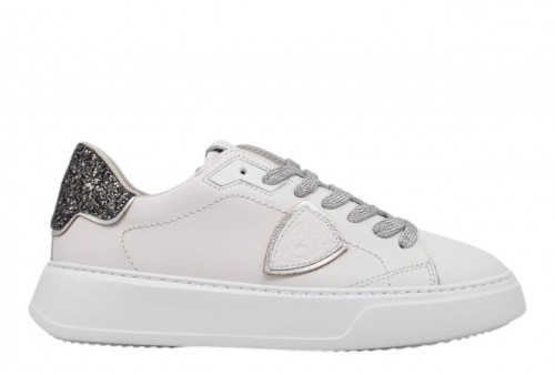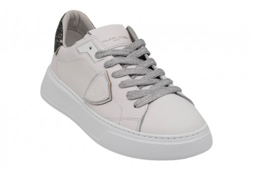 PHILIPPE MODEL DONNA TEMPLE VEAU BTLD VG13 GLITTER. Sneakers Temple Donna con spoiler glitterato, Bianco Nero. Eleva il tuo stile con le nuove sneaker con suola alta da donna Temple: forme essenziali ispirate ai modelli nineties rivisitate con creatività e materiali italiani. La tomaia in morbido vitello bianca è completata da spoiler glitterato che riprende il sottoscudo ed i lacci. La suola di questa scarpa bassa è in gomma ultraleggera.