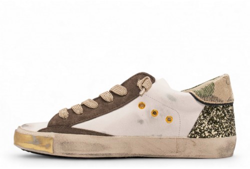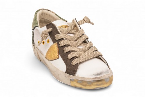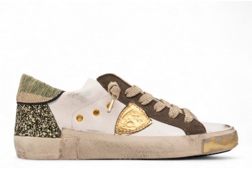 PHILIPPE MODEL SNEAKER PRSX CAMOU GLITTER. Le sneaker Prsx mixano la raffinata essenza francese alla tradizione manifatturiera italiana. Le linee tipiche delle scarpe vintage ispirate alle skate shoes vengono elaborate con una scelta materica raffinata, ricca di glamour e di contrasti, completata da un look volutamente dirty. La tomaia abbina pelle bianca a dettagli oro e verdone. Nota pop il tallone glitterato e lo spoiler camouflage colibrì. La costruzione rimane quella iconica con scudetto embossed sul lato e fasciatura artigianale della suola con sporcature e dettagli oro.