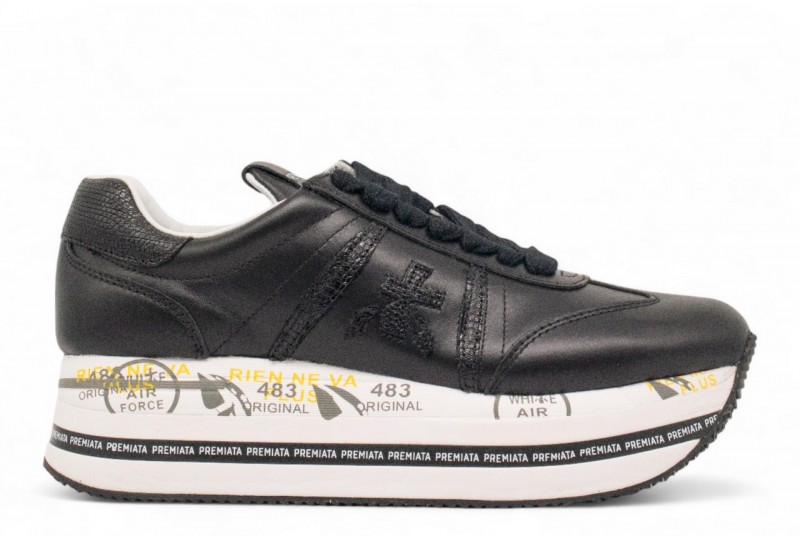 PREMIATA BETH_7107 Sneakers donna. Sneakers con tomaia interamente realizzata in pregiata pelle nera, fondo platform personalizzato con serigrafia logata Premiata.