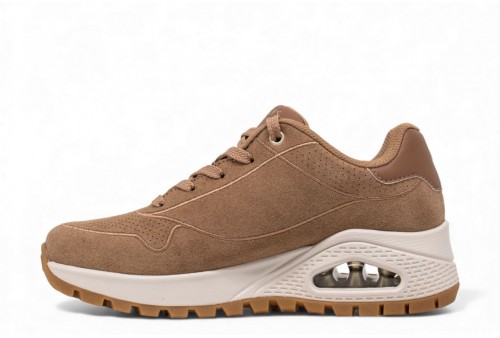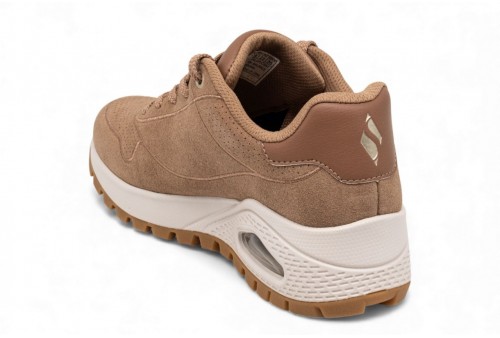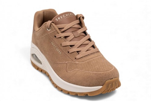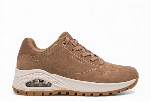 SKECHERS Uno Sneakers donna. La scarpa che unisce uno stile sportivo classico al massimo comfort. Questa sneaker stringata presenta una tomaia in materiale sintetico Durabuck con finiture traforate, soletta interna Air Cooled Memory Foam® e zeppa con plateau e intersuola ammortizzata ad aria con tecnologia visibile Skech-Air.
