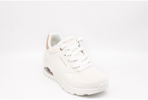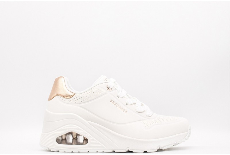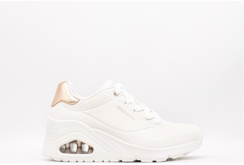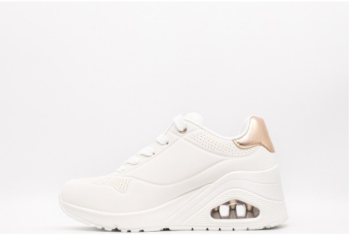 SKECHERS Uno Wedge - HI Steps. Rinnova il tuo guardaroba con un tocco di comfort indossando Skechers Street™ Uno Wedge - HI Steps. Questo modello fashion presenta una tomaia in durabuck con finiture in duraleather metallizzato, soletta Skechers Air-Cooled Memory Foam® e un’intersuola a zeppa platform con ammortizzazione ad aria visibile Skech-Air