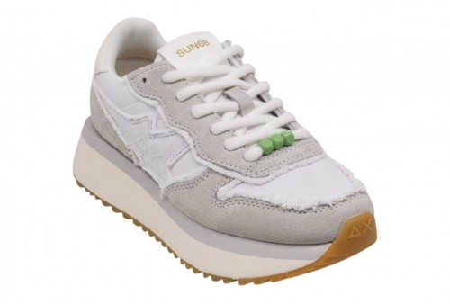 SUN68 DONNA Z36223/01 BIG STARGIRL CANVAS BIANCO . La versione Big Stargirl che interpreta le atmosfere leggere della stagione. La sneaker iconica SUN68 è proposta in suede e canvas con bordi sfrangiati, mentre le perline colorate che decorano l'allacciatura enfatizzano l'attitudine ironica del modello. Dalle passeggiate in città ai weekend fuori porta, è perfetta da abbinare alla borsa con frange della collezione per richiamare i dettagli della tomaia e definire un look dal fascino ricercato.