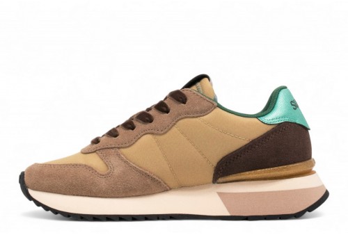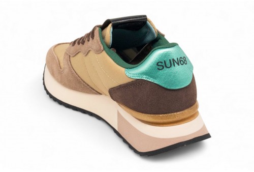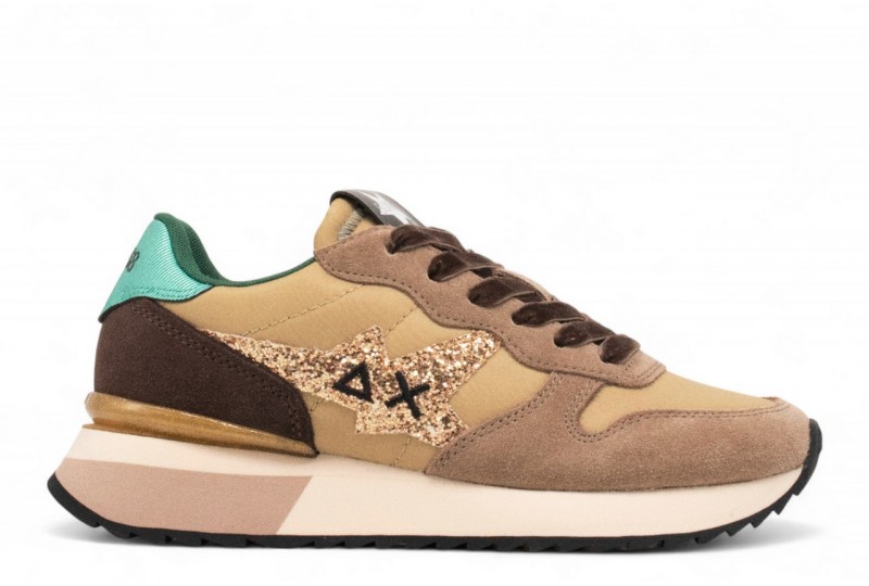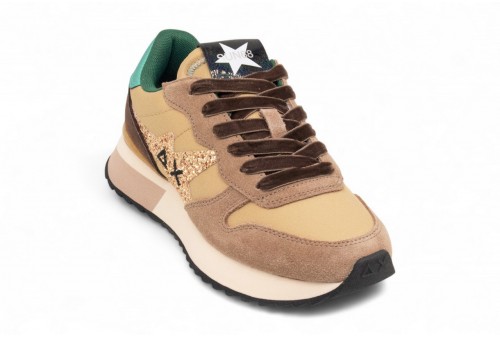 SUN68 SNEAKERS STAR GIRL GLITTER .La sneaker Ally Vintage si ispira all'icona SUN68 e la reinterpreta con un ricercato effetto used, lo spoiler in suede animalier e il lettering "Run faster" che decora la suola. Realizzata in nylon e suede con dettaglio laminato. Etichetta logata con stella sulla linguetta. Patch glitter con logo ricamato sul lato. Chiusura con lacci in velluto.Fodera in micro mesh. Suola EVA fresata e battistrada in gomma.COLORE: BEIGE SCURO