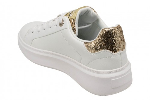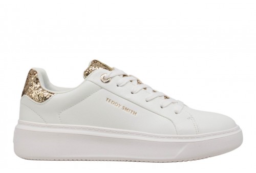TEDDY SMITH donna SNEAKER 120121 bianco/oro. Sneaker low cut realizzata in PU con dettaglio glitter. Logo laterale. Linguetta gliterata con label logata. Spoiler glitterato . Chiusura con lacci.