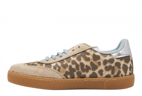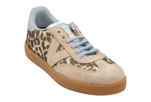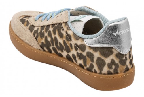 VICTORIA DONNA 1126236 BEIGE. Scarpe animal print per donna realizzate in Spagna con dettagli sovrapposti in camoscio tono su tono. Dettaglio posteriore metallizzato. Chiusura con lacci rotondi blu, coordinati con la fodera interna, e linguetta perforata. Suola in T.R. traslucido color ambrato.