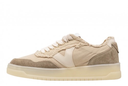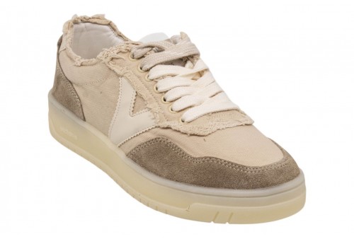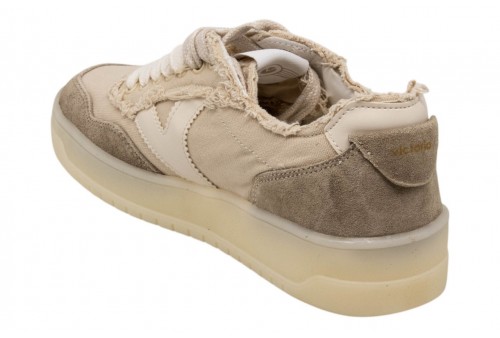VICTORIA DONNA 1257146 BEIGE. Scarpe sportive unisex in tela sfilacciata con parti in effetto casmocio tono su tono. V di victoria laterale in effetto pelle bianca a contrasto. Chiusura con lacci bicolore: alcuni bianchi e altri tono su tono. Suola bianca in TPR traslucido.