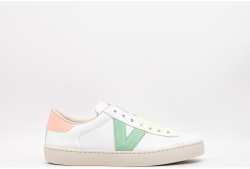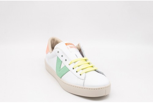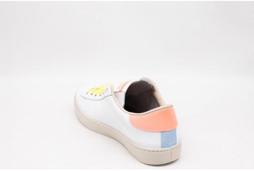 VICTORIA Sneakers donna. Le nostre esclusive sneakers bianche da donna in pelle bovina di alta qualità sono prodotte in Spagna e dotate della medaglia d'argento distintiva della certificazione LWG (Leather Working Group) che garantisce un processo di concia responsabile, un uso efficiente dell'acqua, dell'energia e una gestione sostenibile dei rifiuti. Elemento neon sul retro abbinato all'etichetta della linguetta e dettagli multicolore sul tallone, sul logo e sui lacci. La suola marrone chiaro è realizzata con oli vegetali anziché minerali per ridurre l'impatto ambientale. Inoltre, queste sneakers bianche in pelle per donna sono dotate di una soletta ancora più ergonomica realizzata con materiali riciclati, che ne garantiscono il massimo comfort.