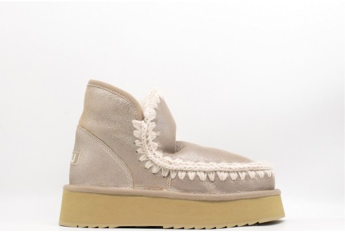 MOU Mini eskimo platform boot. Novità per l'autunno-inverno 2024: il mini eskimo platform boot è ora disponibile in un'ampia varietà di finiture metallizzate. Sapientemente realizzato a mano in lussuoso camoscio, presenta le cuciture in lana all'uncinetto distintive di mou. Incredibilmente confortevole e resistente con suola in gomma EVA. Altezza 18 cm.