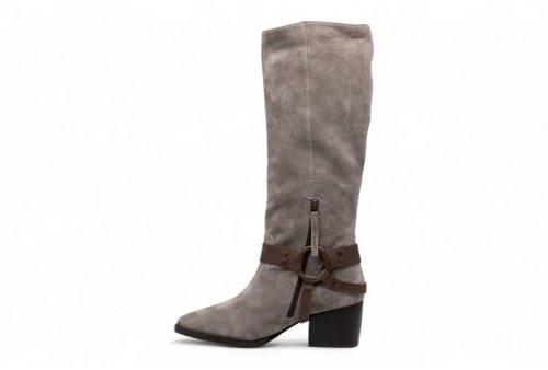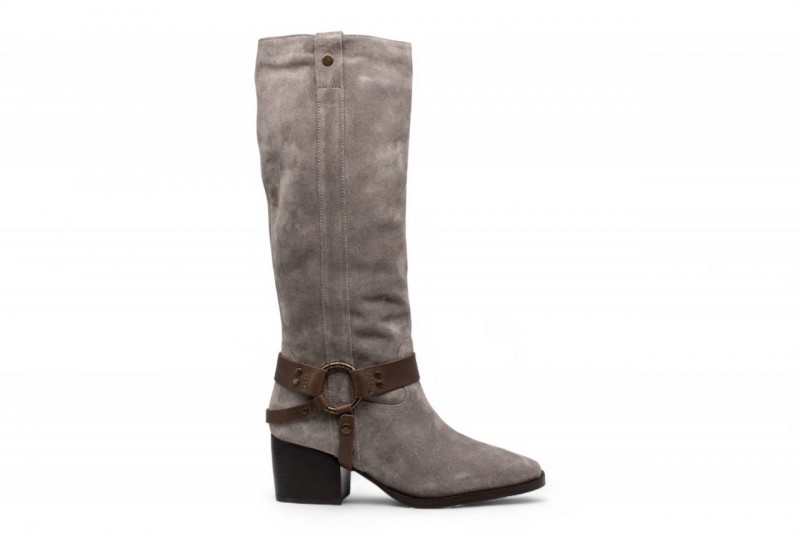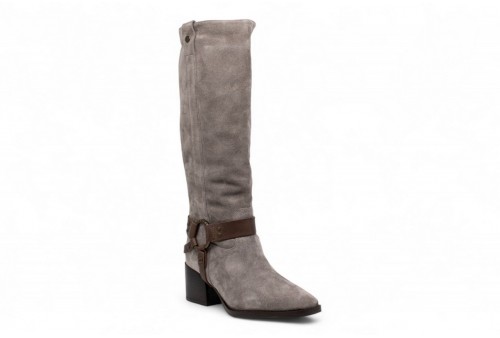 JANET E JANET stivale texano in camoscio .Il fascino del West incontra lo stile urban. Questo stivale diventa il simbolo di una femminilità libera, capace di muoversi tra avventura e quotidiano con la stessa naturale eleganza.Realizzato in camoscio con dettaglio fibbia. Suola in gomma. COLORE: pietra