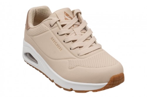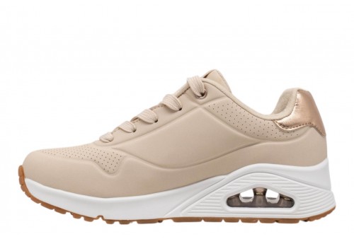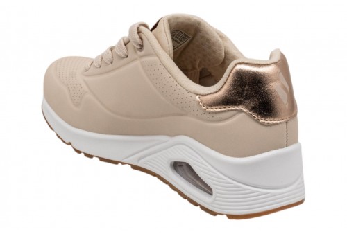 SKECHERS UNO - Golden Air. Scegli l’oro e migliora il tuo stile con Skechers Street™ Uno - Golden Air. Questo modello allacciato di tendenza presenta una tomaia liscia in durabuck con dettagli dorati, una comoda soletta con ammortizzazione Skechers Air Cooled Memory Foam® e intersuola ad aria visibile Skech-Air®.