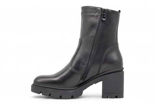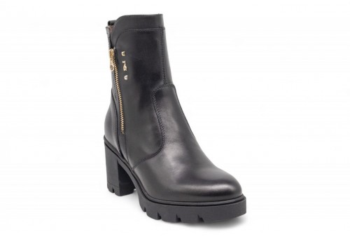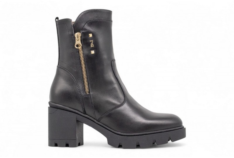 NERO GIARDINI stivaletto in pelle. Stivaletto con tacco a blocco realizzato in pelle con dettaglio zip laterale dorata.Chiusura con zip . Fondo in gomma dentellato. COLORE: nero
