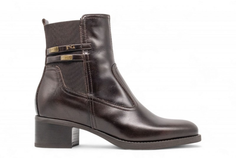 NERO GIARDINI tronchetto in pelle. Tronchetto realizzato in pelle con inserto elastico laterale. Dettaglio cinturini con logo. Cuciture tono su tono. Tacco a blocco. Fondo in gomma . COLORE: t.moro