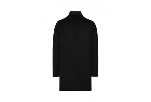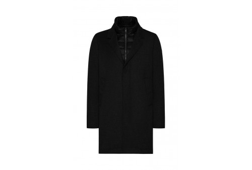 DUNO CAPPOTTO FONDO. Cappotto in lana tecnica con imbottitura in piuma, caratterizzato da pettorina staccabile in piumino di tessuto tecnico superlight con collo in piedi e chiusura con zip doppio cursore. Chiusura frontale con bottoni nascosti da patta, tasche laterali con filetto, spacco centrale al fondo dietro chiuso con automatico. Inserto in neoprene a tono di colore con logo a rilievo inserito sul retro del collo. All'interno tasche multifunzione con dettaglio di filetto catarifrangente.