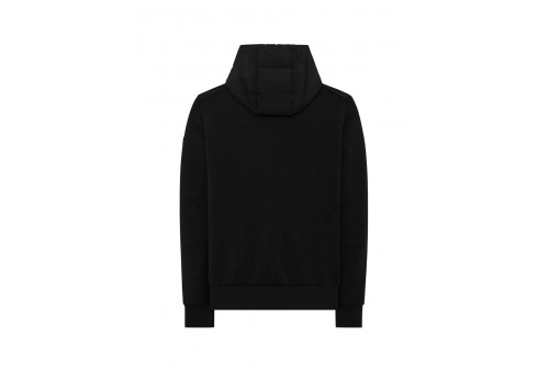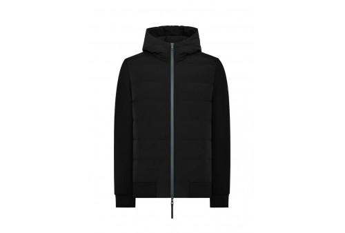 DUNO GIACCA CON CAPPUCCIO GIANT. Giacca con cappuccio bi-materiale realizzata in piumino di tessuto tecnico bi-stretch e jersey di cotone tecnico. Chiusura frontale con zip water-resistant doppio cursore, tasche laterali con zip invisibile nascosta nel fianco, fondo e polsi con balze in tessuto di cotone. All'interno trapunta leggera di tessuto tecnico superlight e tasche multifunzione.
