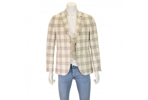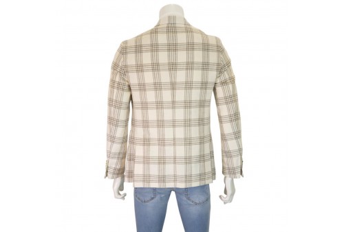PAOLONI GIACCA A QUADRI. Giacca monopetto con due bottoni frontali realizzata in misto lino, lana vergine e cotone. Revers a lancia. Tasche frontali. Spacchetti sul retro. COLORE: BIANCO