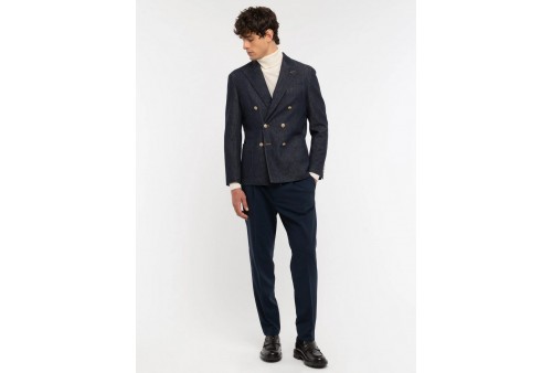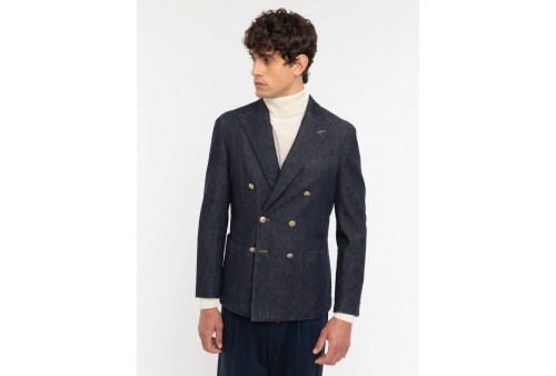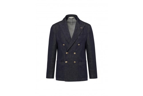 PAOLONI Giacca doppiopetto lavata in denim stretch. Giacca doppiopetto sfoderata lavata, chiusura con bottoni metallo, ampio rever a lancia, due tasche a toppa un taschino frontali, quattro bottoni ai polsi, spacchi laterali sul retro, finiture con impunture. Denim in cotone stretch.