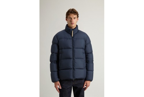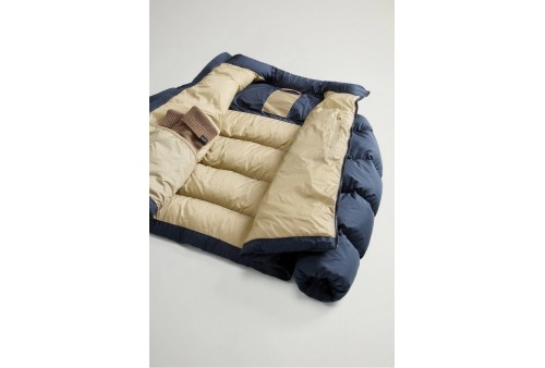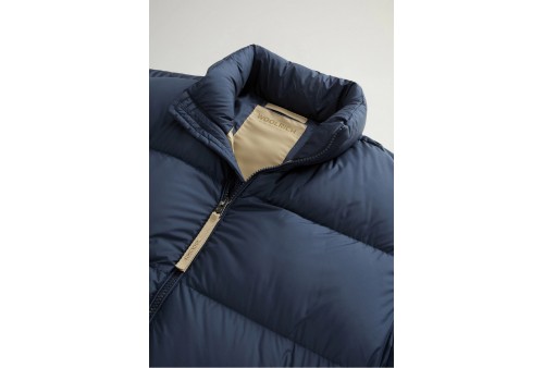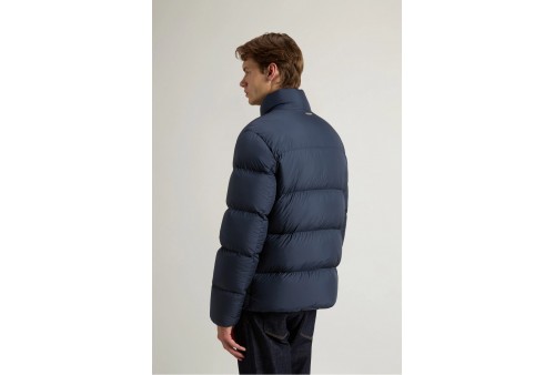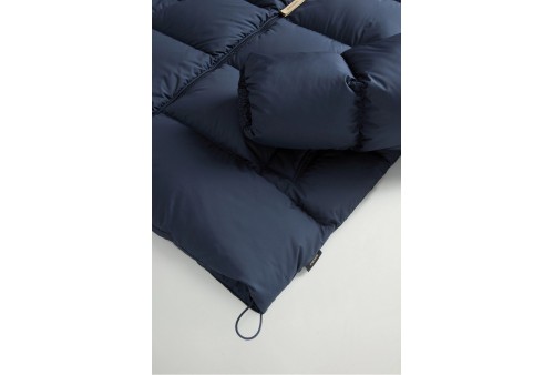 WOOLRICH Piumino Cloud in microfibra. Perfetto alleato contro i primi freddi, questo piumino della Cloud Series – la nostra capsule di capispalla caldi ma leggeri come una nuvola – è un must-have del guardaroba di stagione. Realizzato in microfibra idrorepellente e resistente al vento, è imbottito in piuma d’anatra per offrire un calore avvolgente senza appesantire. Il design include un collo alto per una protezione extra e una zip bidirezionale con tirazip logata, mentre le tasche a filetto con bottoni a pressione nascosti e le due tasche interne, una laterale e una con zip, garantiscono praticità e spazio per gli oggetti personali. La coulisse interna sul fondo consente di regolare la vestibilità in base alle esigenze. Completano il capo il logo stampato sul retro e l’etichetta laterale.