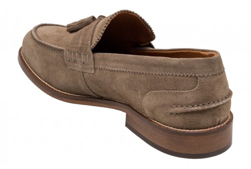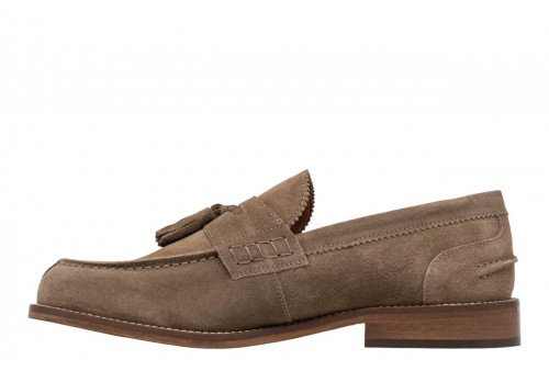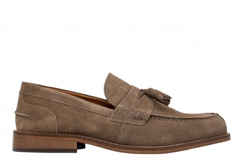 EXTON MOCASSINO CAMOSCIO 2143 taupe. Mocassino uomo realizzato in pelle scamosciata con mascherina e nappine. . Cuciture tono su tono.Fondo cuoio con antiscivolo.