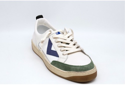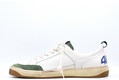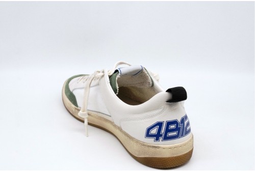 4B12 SNEAKERS LAKERS-001. Sneakers bassa da uomo realizzata in pelle con inserti in pelle scamosciata verde. Dettaglio laterale in pelle blu. Logo sul retro a contrasto. COLORE: BAINCO/VERDE/BLU