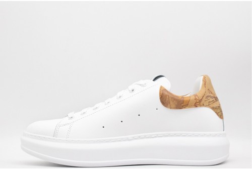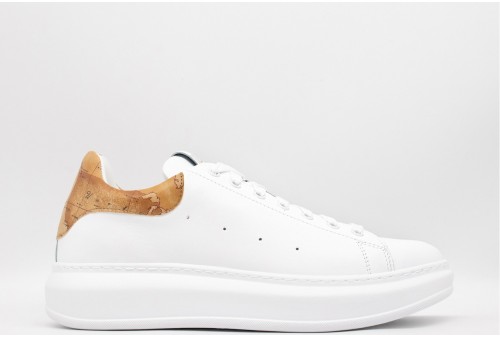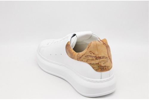 ALVIERO MARTINI SNEAKER uomo. Sneakers realizzata in pelle e inserto al tallone in pelle con stampa cartina geografica. Chiusura con stringhe. Colore: white