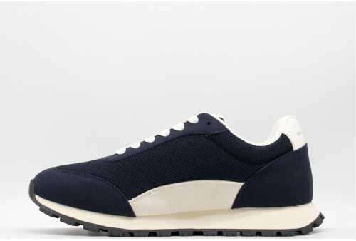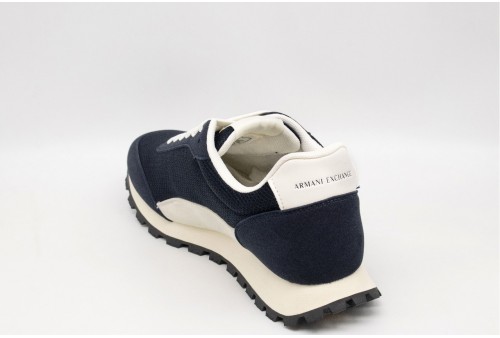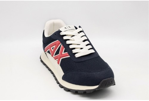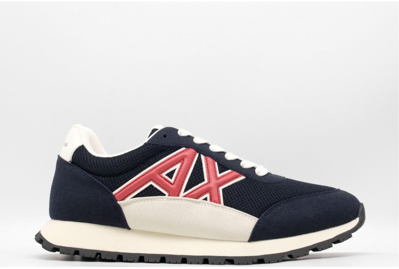 ARMANI EXCHANGE SNEAKER UOMO. Sneaker realizzata in tessuto con inserti scamosciati blu e dettagli in ecopelle bianco. Logo laterale rosso. Logo al tallone e sulla linguetta. COLORE: navy/cardinal
