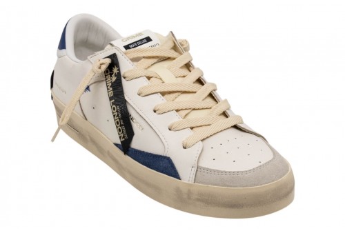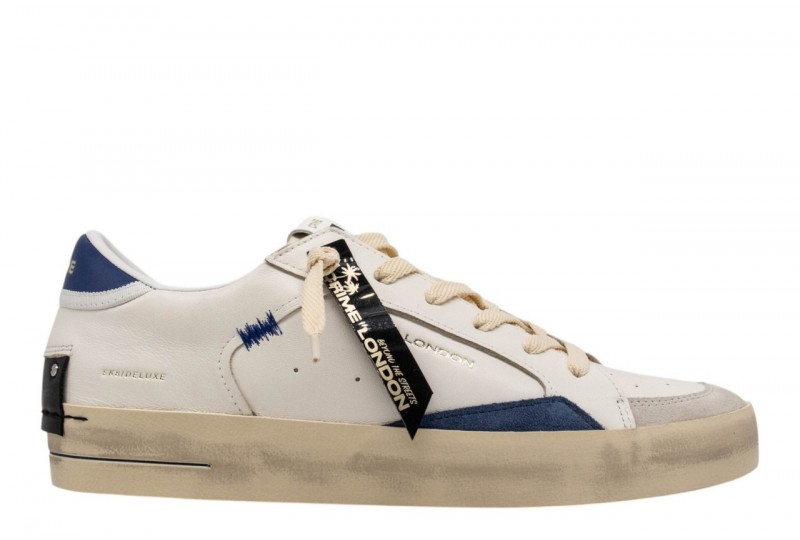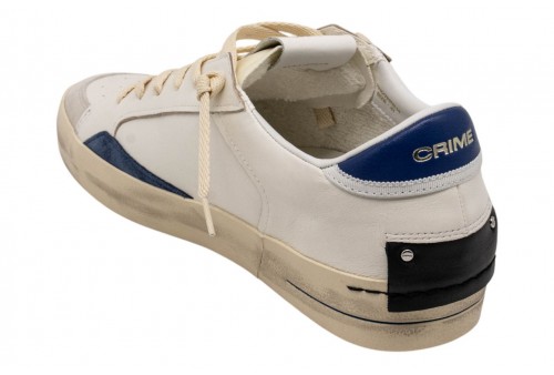 CRIME uomo 19107PP8.14 SK8 DELUXE IVORY. Sneaker realizzata con materiali di alta qualità Made in Italy. Tomaia in pelle bianca,dettagli in suede blu.Talloncino in pelle blu.Linguetta in bianca con label logata in tessuto. Patch in pelle nera sul retro.Lacci avorioi in poliestere.Unico tag neroo. Fodera in pelle e tessuto. Suola in ecopelle fasciata beige, alta 2.5 - 3 cm. Effetto vintage.
