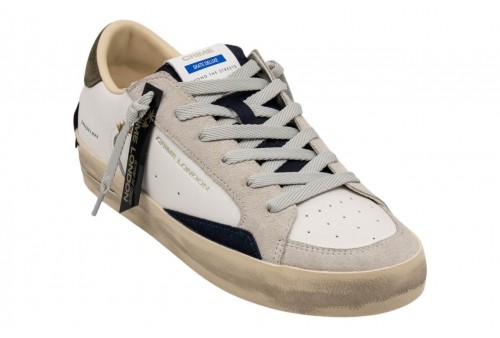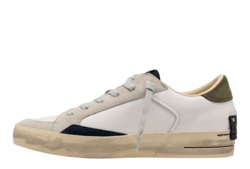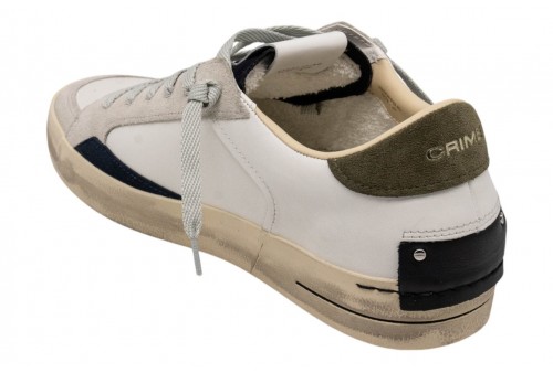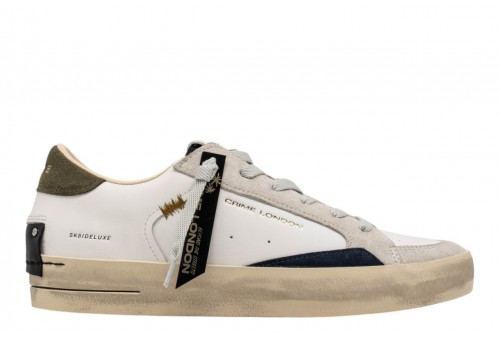 CRIME uomo 19110PP8.10 SK8 DELUXE. Sneaker realizzata con materiali di alta qualità Made in Italy. Tomaia in pelle bianca, dettagli in suede. Talloncino in suede verde militare.Linguetta in suede nero con label logata in pelle. Patch in pelle nera sul retro.Lacci neri in poliestere.Unico tag nero. Fodera in pelle e tessuto. Suola in ecopelle fasciata beige, alta 2.5 - 3 cm. Effetto vintage.