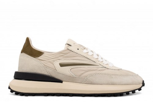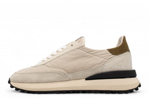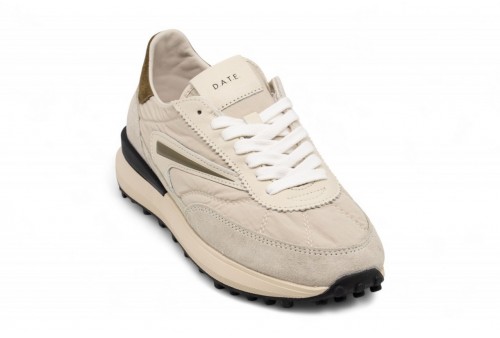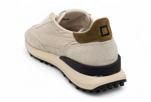 DATE ATHLETA NYLON BEIGE. Running sneakers in nylon e suede colore beige. Sulla linguetta la scritta D.A.T.E. è impressa. I lacci sono in cotone. Il logo quadrato è ricamato sul talloncino in suede colore verde militare. Dettaglio laterale impresso colore verde militare. Fodera in pelle e spugna di cotone. Il soletto interno è rialzato di 2.5 cm per un migliore comfort.